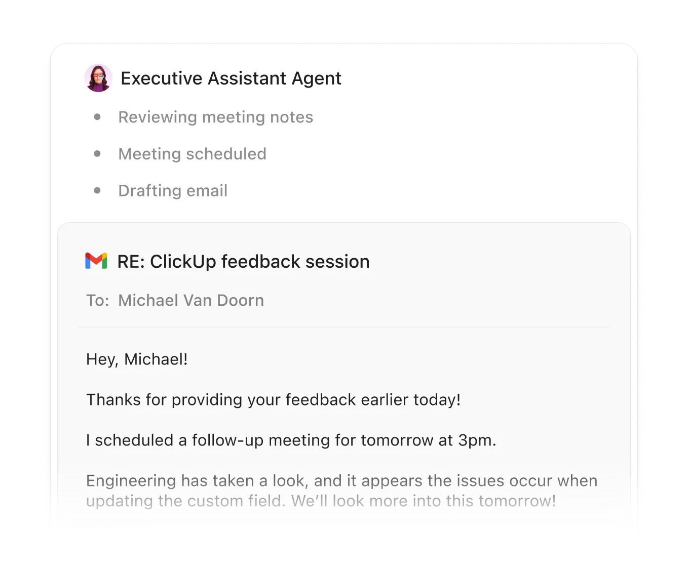 Super Agents manage, draft, and send clear, accurate emails based on context in ClickUp.